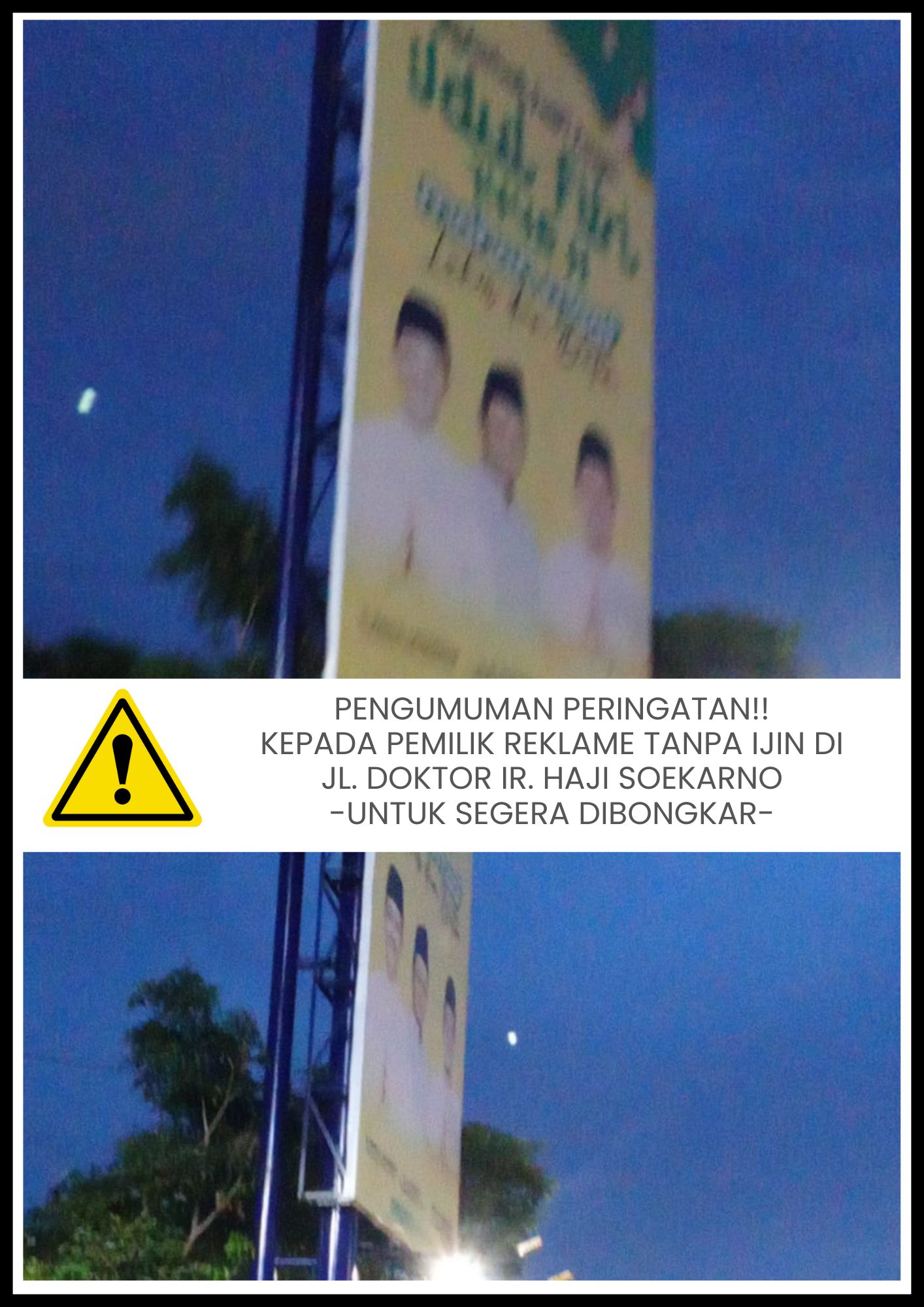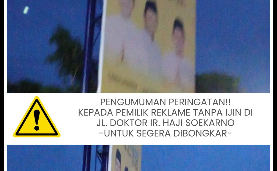 PENGUMUMAN PERINGATAN!! KEPADA PEMILIK REKLAME TANPA IJIN DI JL. DOKTOR IR. HAJI SOEKARNO -UNTUK SEGERA DIBONGKAR-